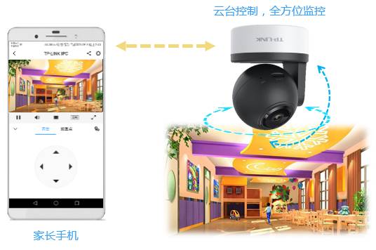 TP-LINK云台摄像机支持360°全视野监控,家长可通过手机APP的云台按键远程操控云台旋转,调整监控角度,对教室进行无死角监控。