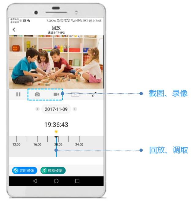 家长通过手机可以实时回放摄像机中的录像文件,截图或录像存储至手机本地,将数据保存在自己手中,随时还原过往,留住美好时刻。