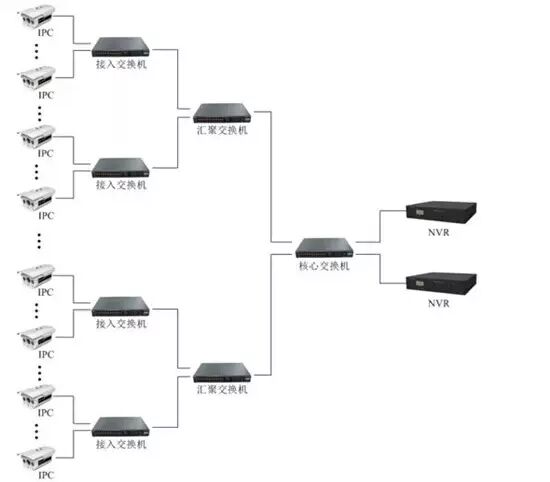 针对于50个点以上的中大型工程,需要采用三层网络架构:接入层、汇聚层、核心层。同时由于点位较多,对核心层交换机的性能要求较高,一般这种情况下需选择华为或华三等知名厂家的三层全千兆核心交换机。